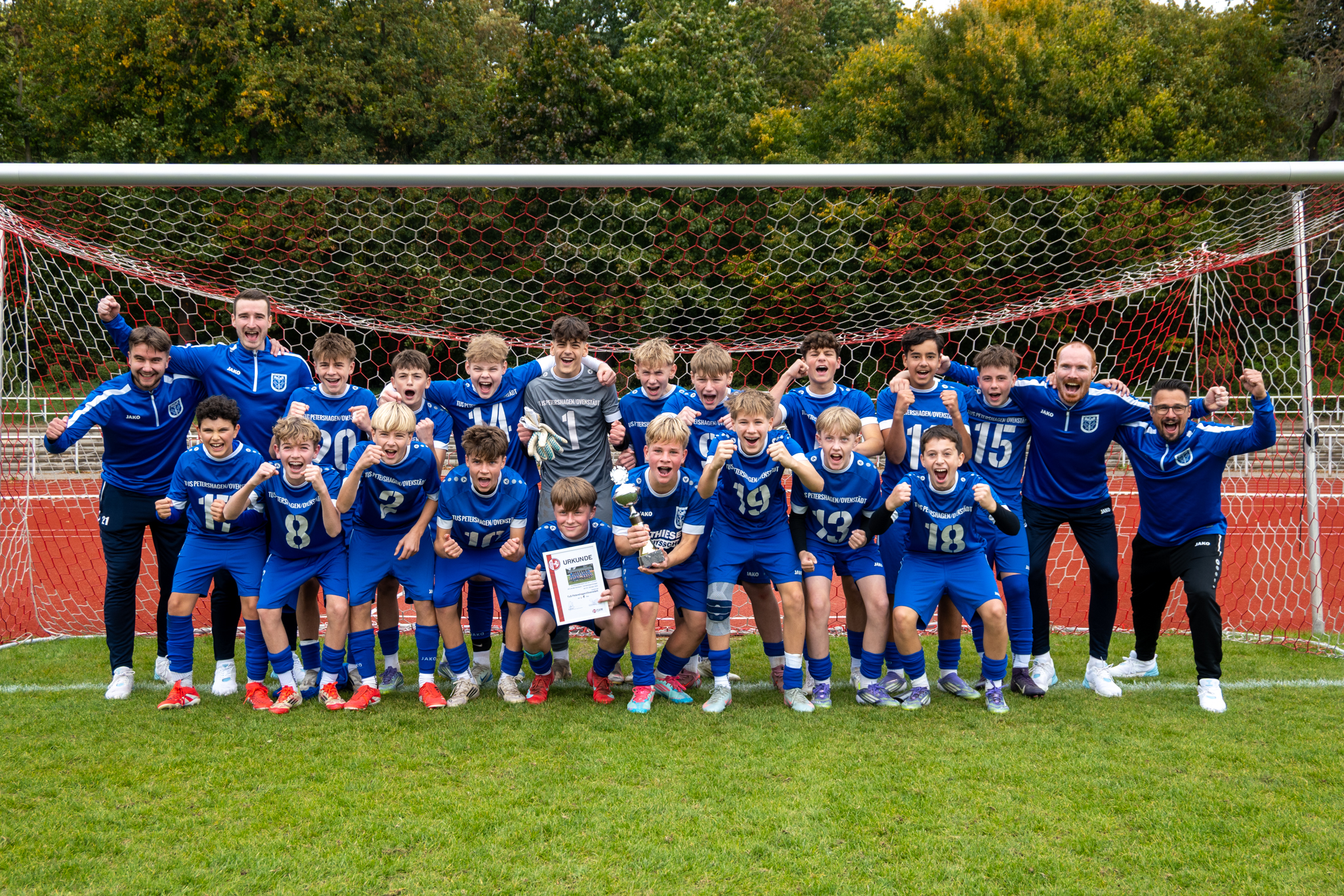 Das Finale der C-Jugend im Weserstadion begann mit einem fulminanten Knall. Malte Meyer erzielte in der ersten Sekunde des Spiel vom Anstoß ein Traumtor. Er überraschte den Torhüter des JFV Lohe-Bad Oeynhausen und brachte unsere Mannschaft früh in Führung. Anschließend entwickelte sich ein spannendes Spiel mit intensiven Zweikämpfen. Unsere Mannschaft ließ wenige Chancen zu und konnte immer wieder gefährliche Konter nach setzen. In der Nachspielzeit des Finales überschlugen sich dann die Ereignisse. Zunächst glich der Gegner nach einem Eigentor von Theo Blanke aus. Als die meisten der ca. 200 Zuschauer schon mit einem Elfmeterschießen rechneten, lief ein letzter Angriff unserer Jungs auf das gegnerische Tor. Andreas Schur konnte nur durch ein Foul gestoppt werden, sodass der Schiedsrichter folgerichtig auf Elfmeter entschied. Den fälligen Strafstoß verwandelte Kapitän Theo Blanke mit einem harten Schuss zentral unter die Latte. Danach gab es für die Spieler und Trainer kein Halten mehr. Als Sieger des Kreispokals geht es nun in der ersten Runde des Westfalenpokals weiter.